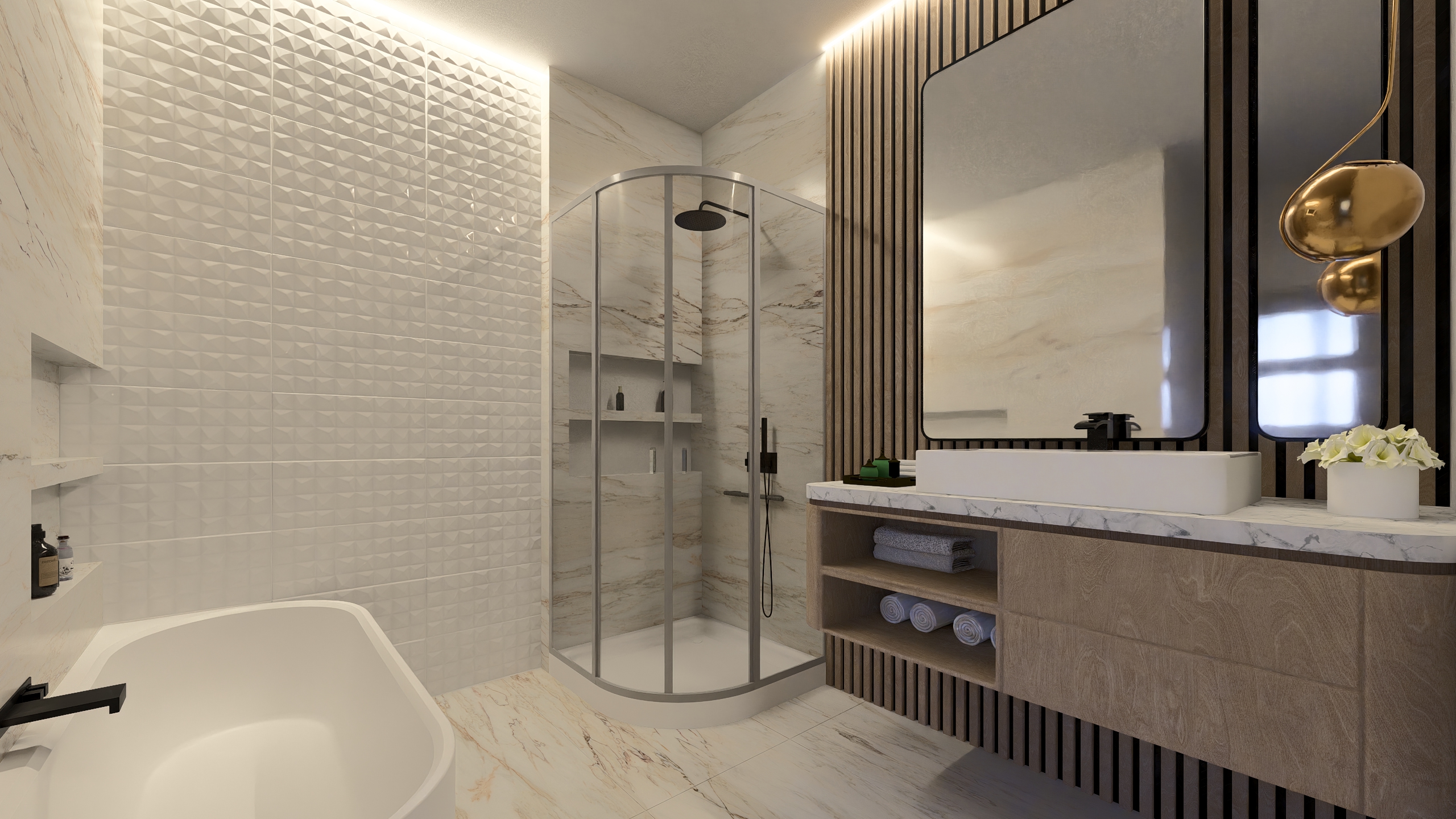 A burkolatok, mint a padló és a falicsempe tetszés szerint kiválasztható.